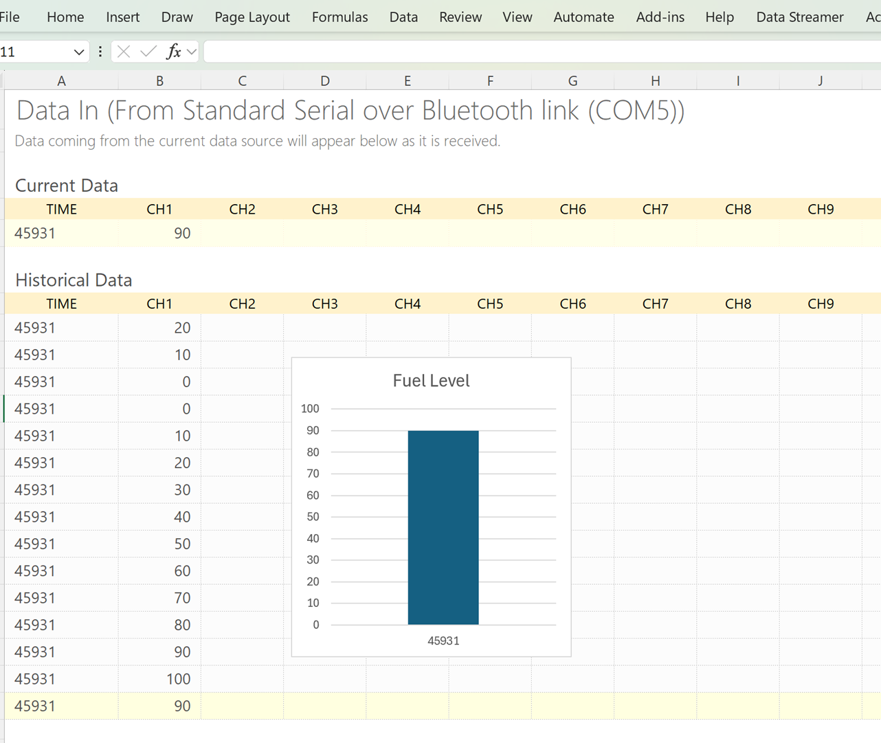 Used MS Excel Data Streamer to capture the data and display it